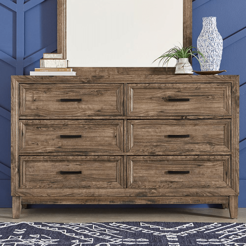 Enhance your room with this 6-drawer Ridgecrest dresser. The cobblestone finish is highlighted by the distressing and antique brass hardware. Softness is added with the picture frame case, tapered leg base, and canted moldings on the drawer fronts.