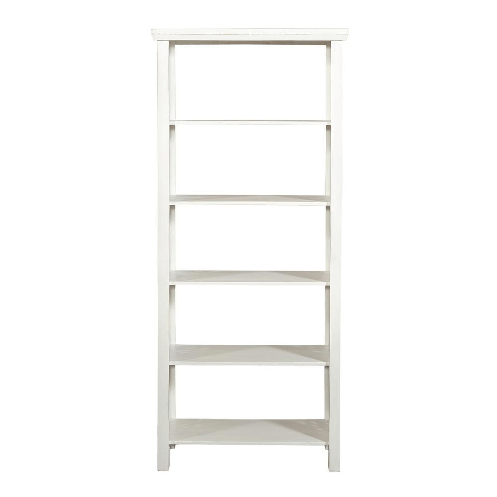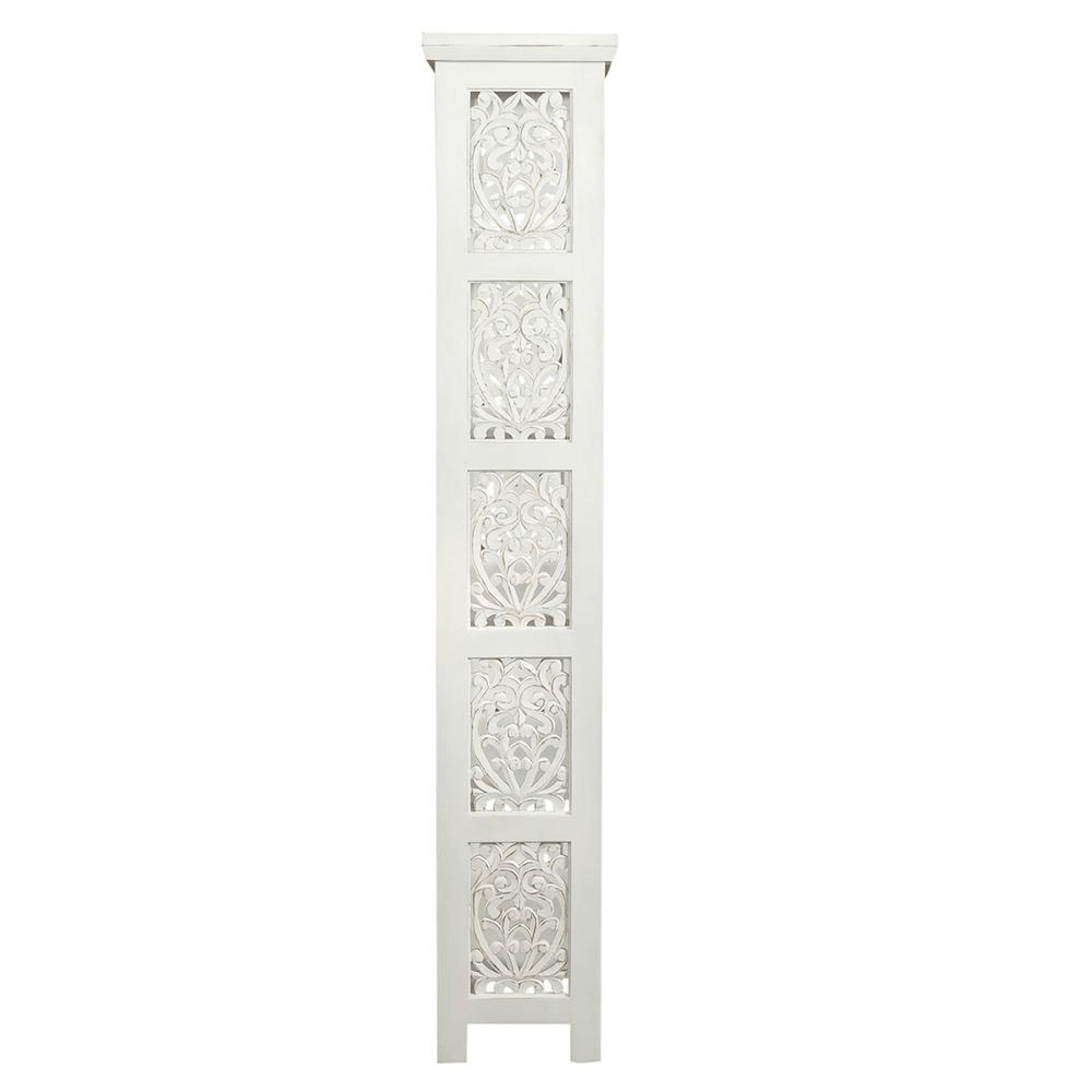 Accent your space with the one-of-a-kind Trellis Lane accent bookcase. Crafted of mango wood, this piece features a weathered white finish with brown rub thru, artisan hand carved end panels, five shelves of storage, anchored by block legs. This timeless bookcase will make a wonderful addition to your traditionally styled home. Add the accent writing desk and chair to complete your look.
