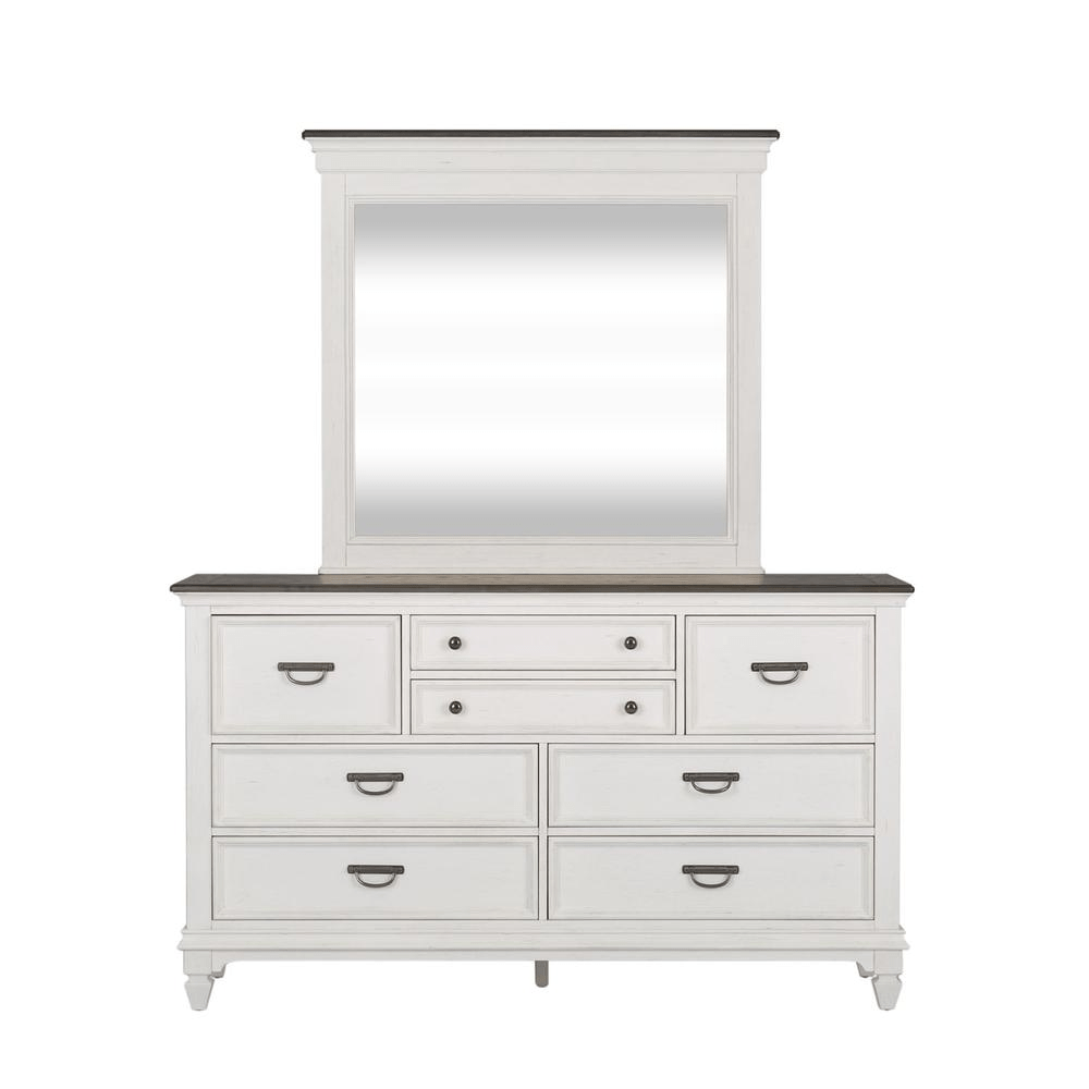 Bring beauty indoors with the Allyson Park dresser and mirror. Crafted of pine solids and veneers with cathedral white oak tops, this kit features a wire brushed white finish with planked charcoal tops, bead molding, full extension drawers with felt lined top drawers, and is accented with antique pewter knob and drop bail hardware. The dresser has eight drawers of varying sizes and pairs well with the crown mirror with its bead molding and beveled edge. Allyson Park offers cottage styles you love in a wire brushed two tone finish that will work from the beach to the mountains to an industrial loft.