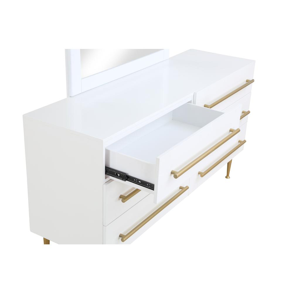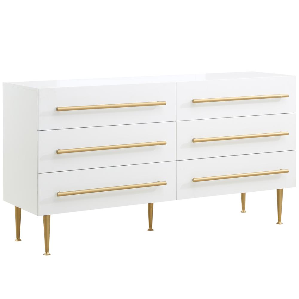 Part of Bellanova collection, this dresser will give your bedroom that modern touch. The dresser features 6 drawers with a soft close mechanism for ample storage space as well as a quiet close function. Dresser has gold legs and accents to give this an entire new look.