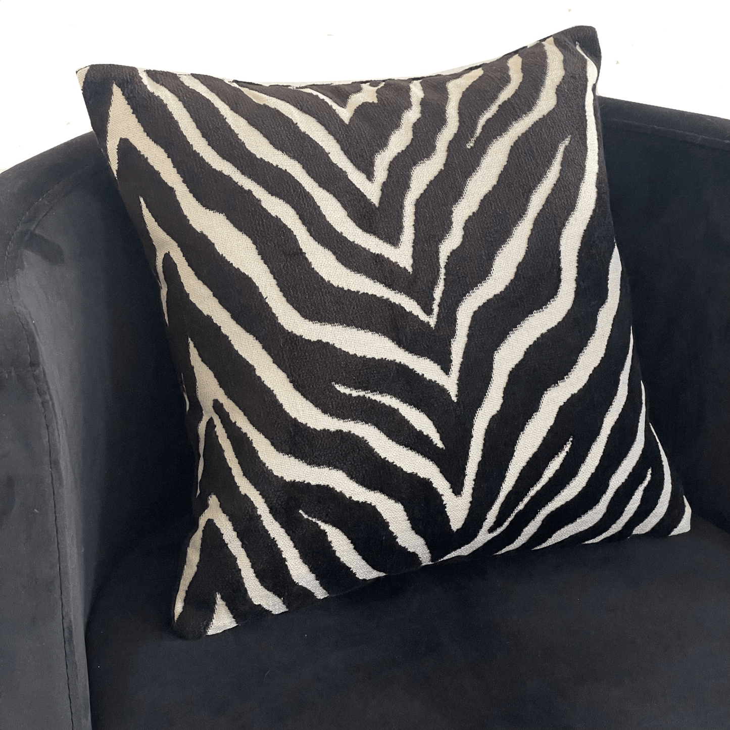 This fashion forward pillow design features unique handcrafted fabric, made from the finest materials to dazzle your eye and feed your senses. This memorable design will add warmth and sophistication to any living space.plutus black zebra black animal motif luxury throw pillow. The fabric of this luxury pillow is a blend of Silk.