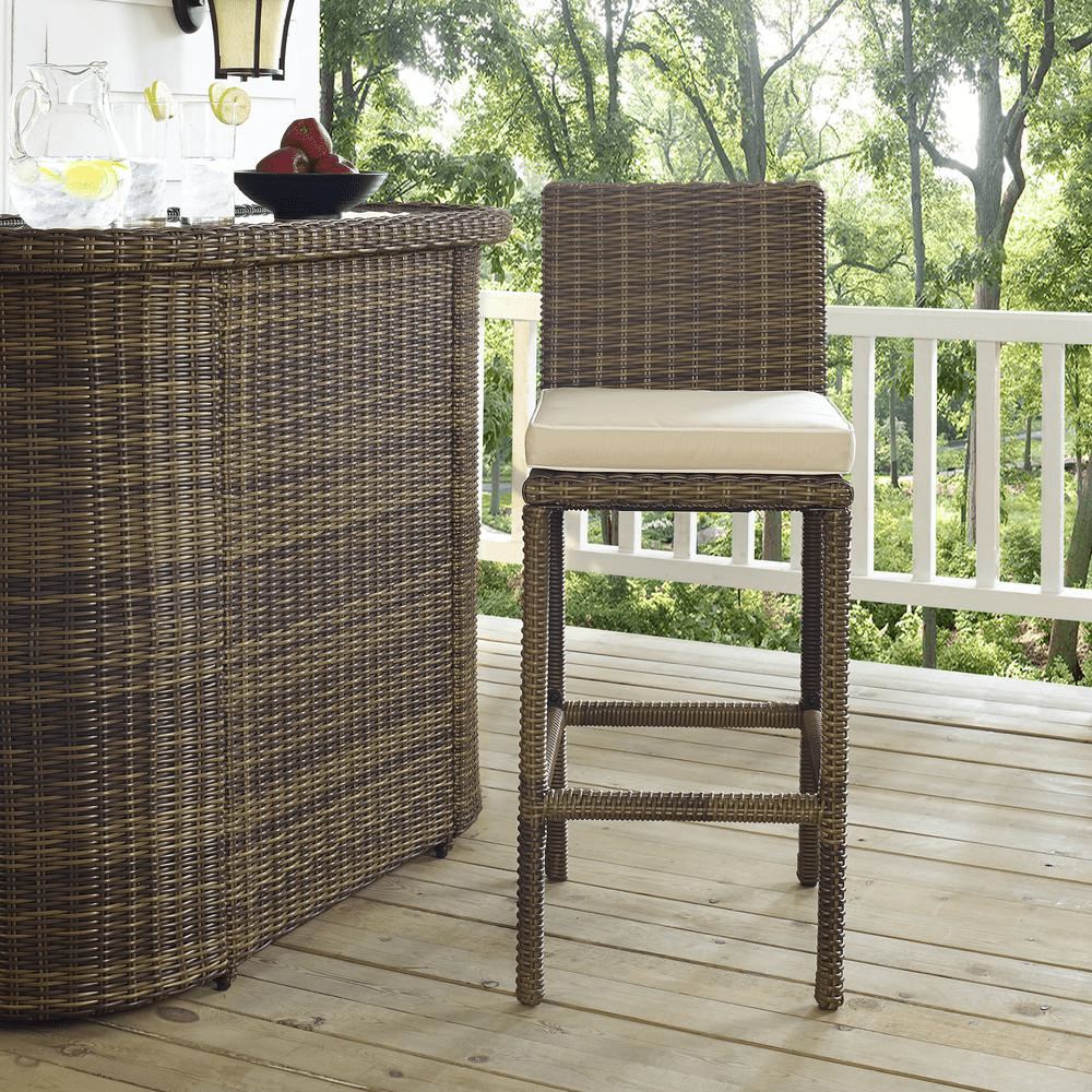 Spend warm summer days and balmy summer nights in luxury with the Bradenton Wicker Bar Stools from Crosley. All-weather wicker and three choices of UV-resistant fabric cushions combine elegant lines with casual comfort in one versatile design with dozens of possibilities. Including two matched stools, this set is ideal for designing a cozy entertaining nook in any outdoor environment.
