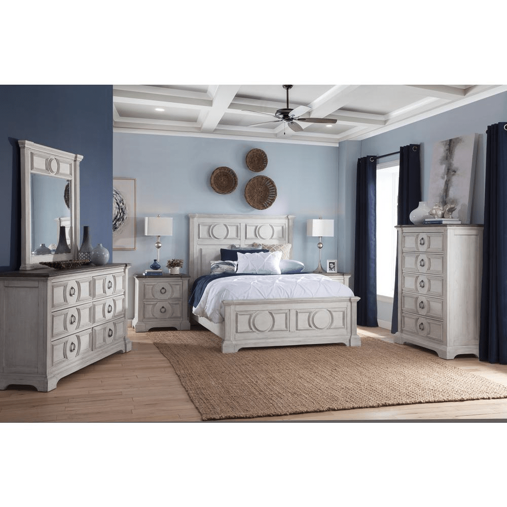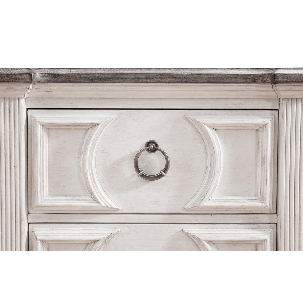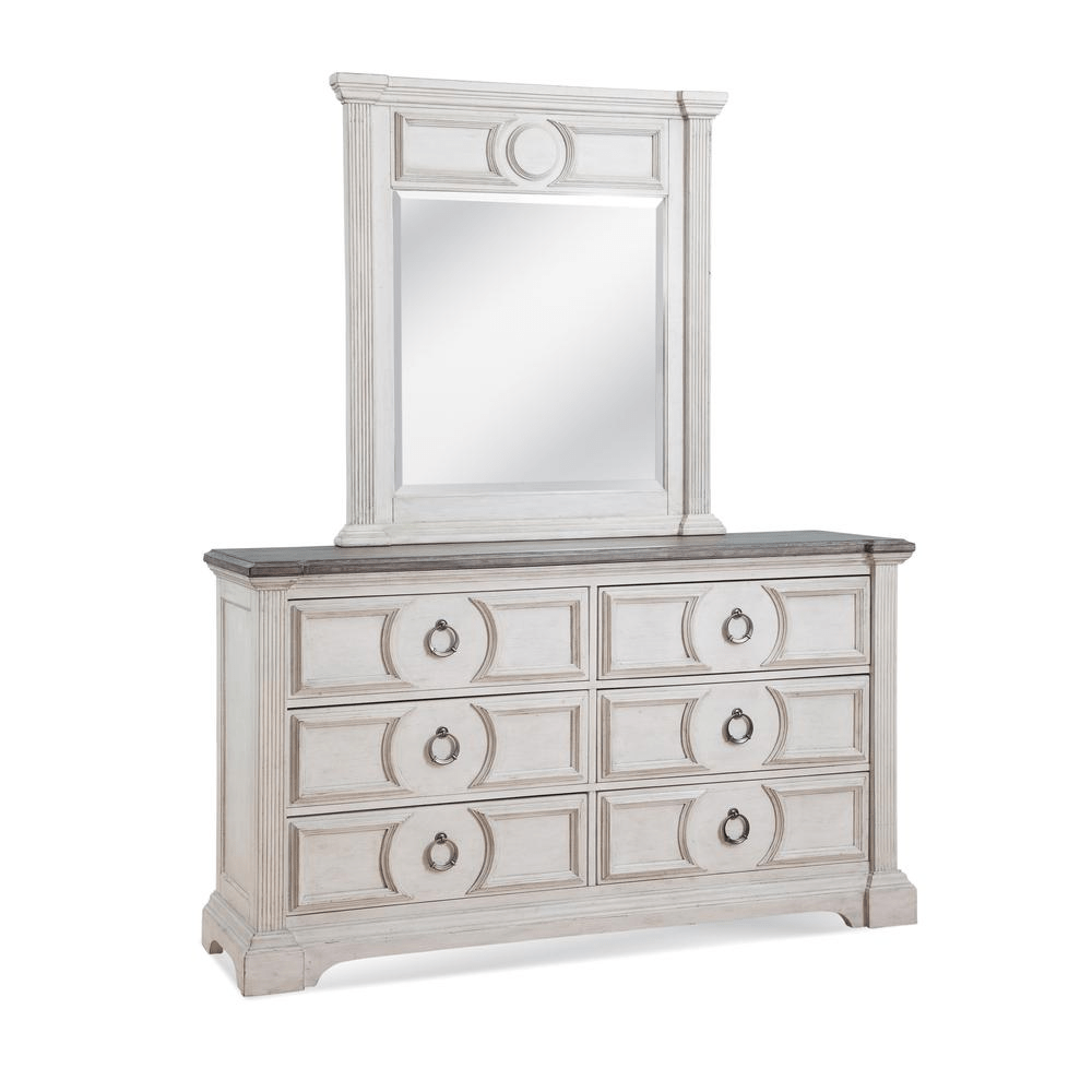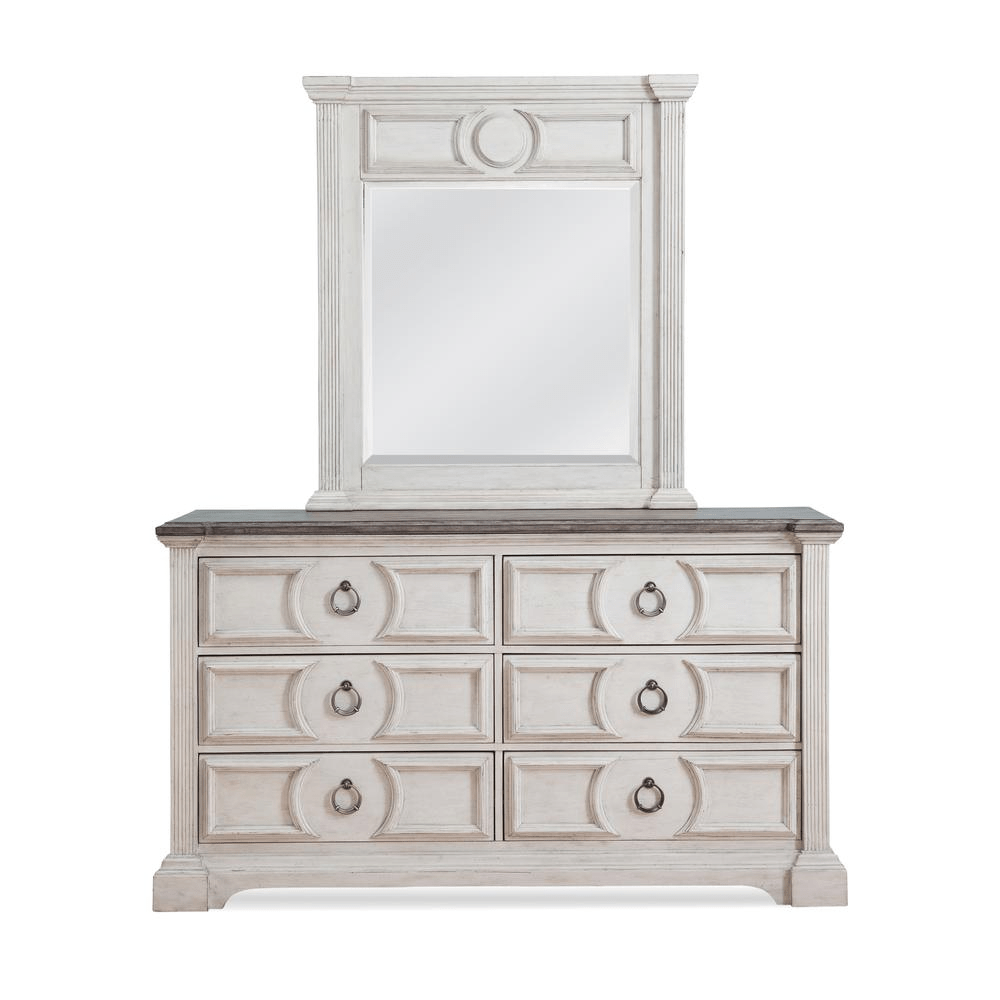 Experience southern charm with a modern twist in the Brighten Bedroom Collection. The heavily distressed antique white finish is complemented by the antique charcoal tops and modern pewter ring drawer pulls. Architectural pilasters frame the pieces and enhance the transitional circular designs and raised moldings of the drawer fronts. The Brighten Dresser and Mirror features 6 spacious drawers for storage with felt lining in the top drawers to protect your finer things. the matching mirror attaches to the dresser and features beveled glass for strength and beauty. Your purchase includes one dresser and one mirror.