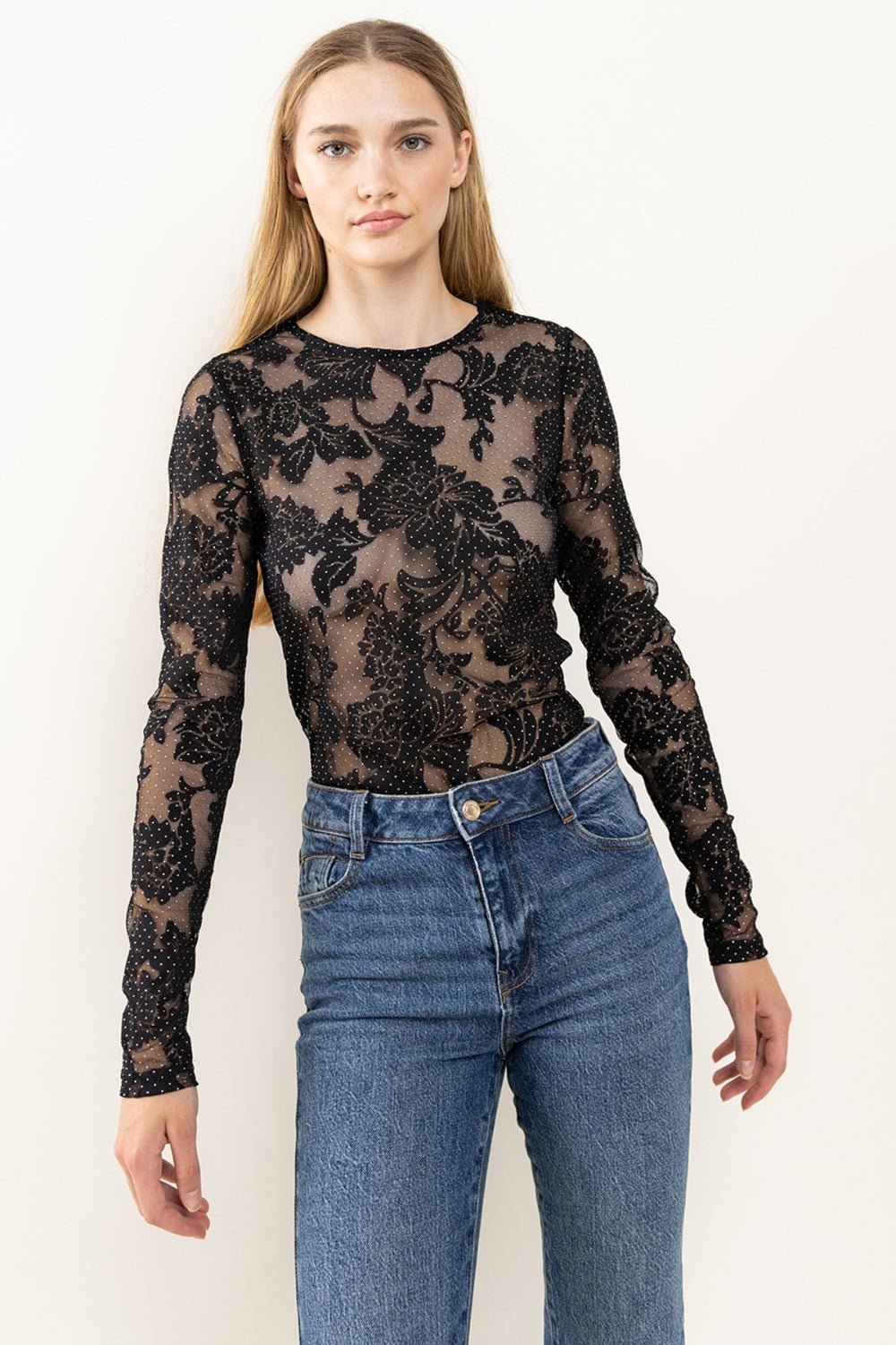 The Floral Lace Mesh Bodysuit features delicate lace detailing and a flattering mesh fabric. The intricate floral design adds a touch of femininity and elegance to any outfit. Perfect for a night out or a special occasion, this bodysuit offers a stylish look. The comfortable and stretchy material provides a flattering silhouette and ensures a comfortable fit. Pair it with high-waisted jeans or a skirt for a trendy and sophisticated ensemble. Elevate your wardrobe with this versatile and stunning bodysuit.