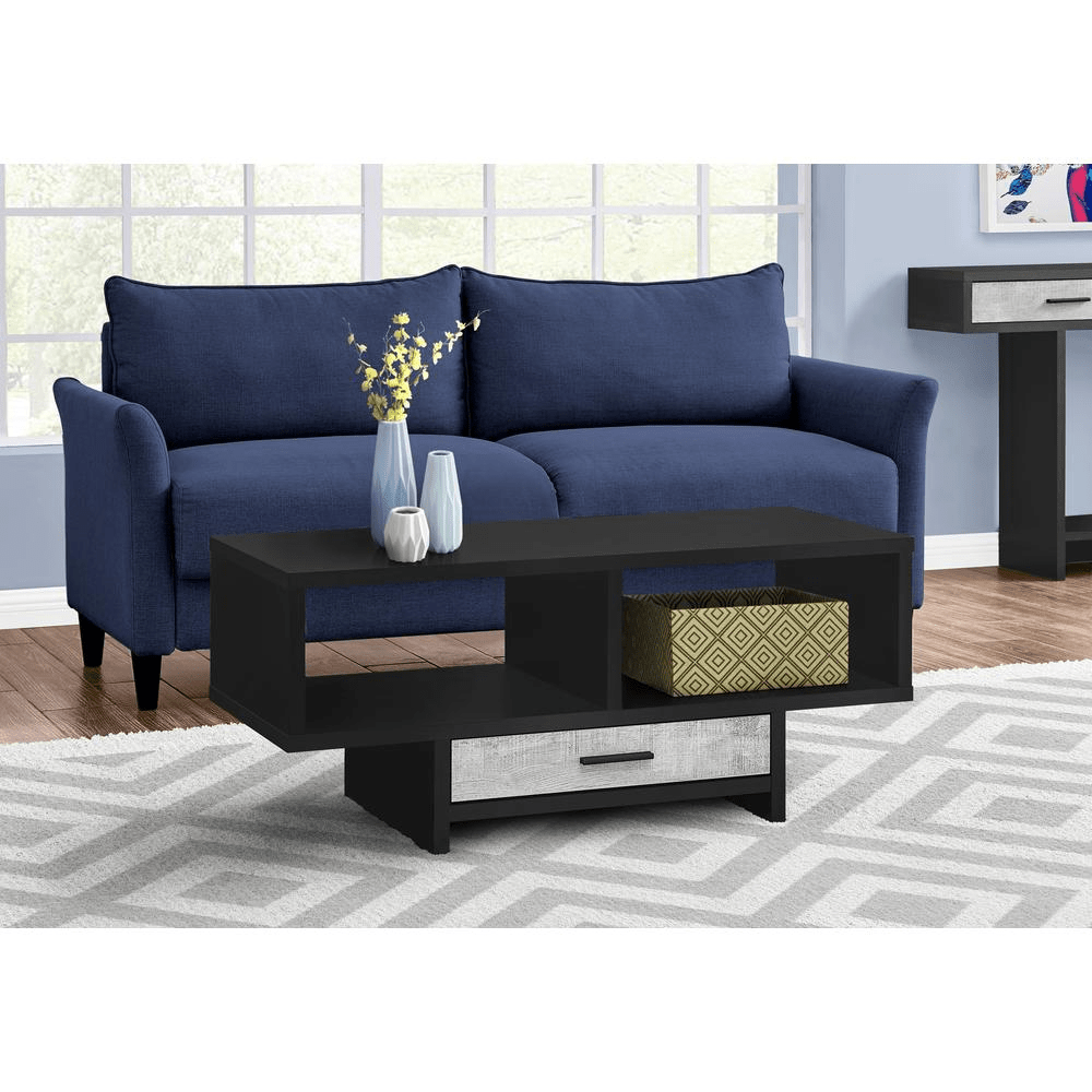 This unique, thick paneled modern style rectangular coffee table with abundant storage options, will give your living or office space that extra presence. Finished on all sides in a sleek black, it includes a warm rustic grey reclaimed wood-look contrasting drawer on smooth metal glides and accented with a black handle, keeping the clutter out of sight. The two spacious open cubbies can be used for creative display or to store books and magazines within easy reach. The spacious and smooth table-top has ample place to set down food and drinks whether working or entertaining. Assembly is required.