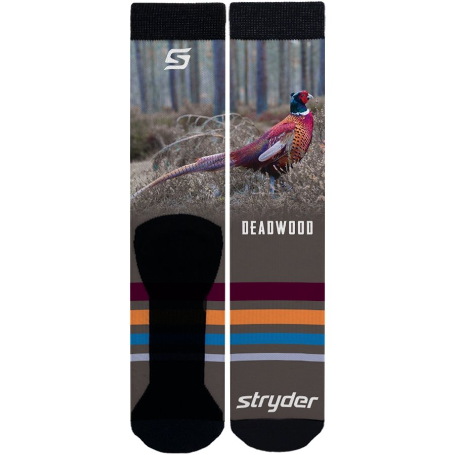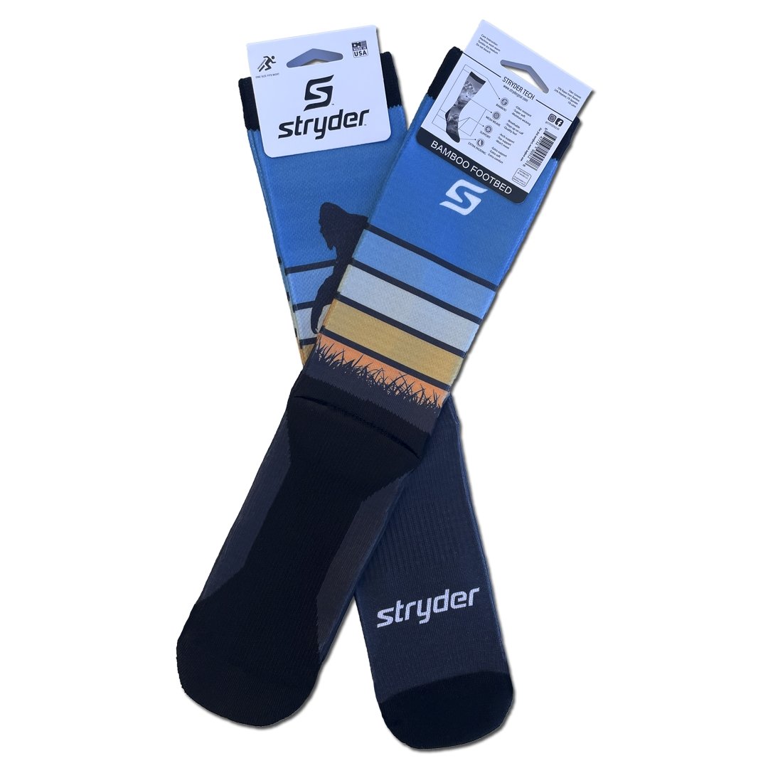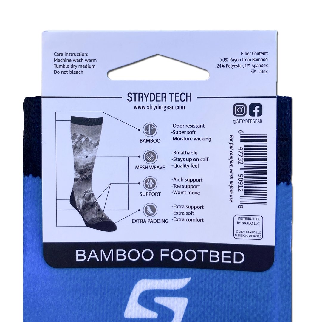 Stryder Socks are a "one size, fit most" mid calf length sock. The foot bed and cuff are made of bamboo and provides extra padding through the sole, and gives support in the arch and toe. With mesh weave on the calf and foot, you get a breathable, and moisture wicking sock.