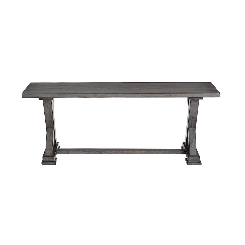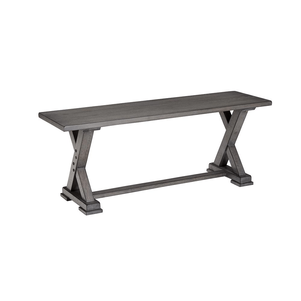 An all wood dining bench in a Harbor Gray finish constructed of Rubberwood solids and Ash veneers with a trestle style base. Transitional styling that makes this bench perfect for an addition to your dining table or as a beautiful accent bench.