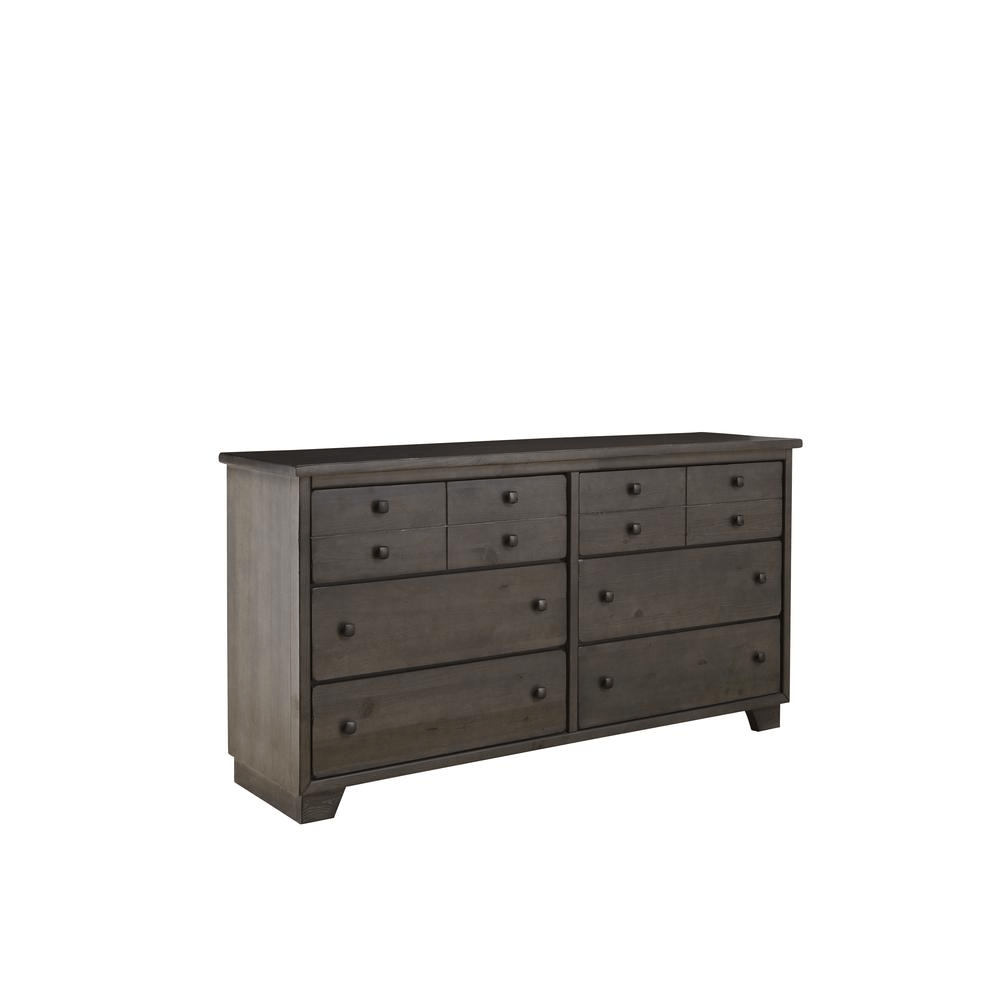 This dresser features simplistic linear detail allowing the architectural lines to create interest. 6 drawers, metal drawer guides, dark antique brass square hardware and a beautiful Storm Gray finish.