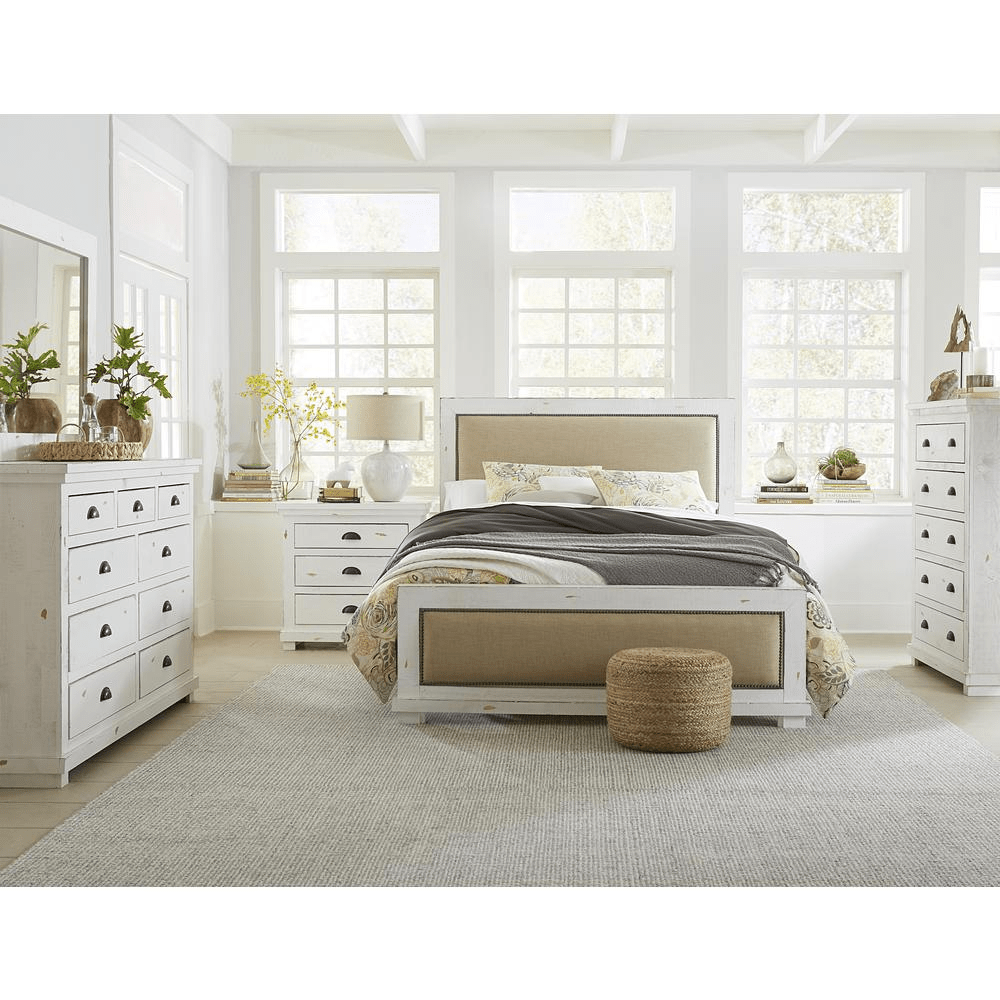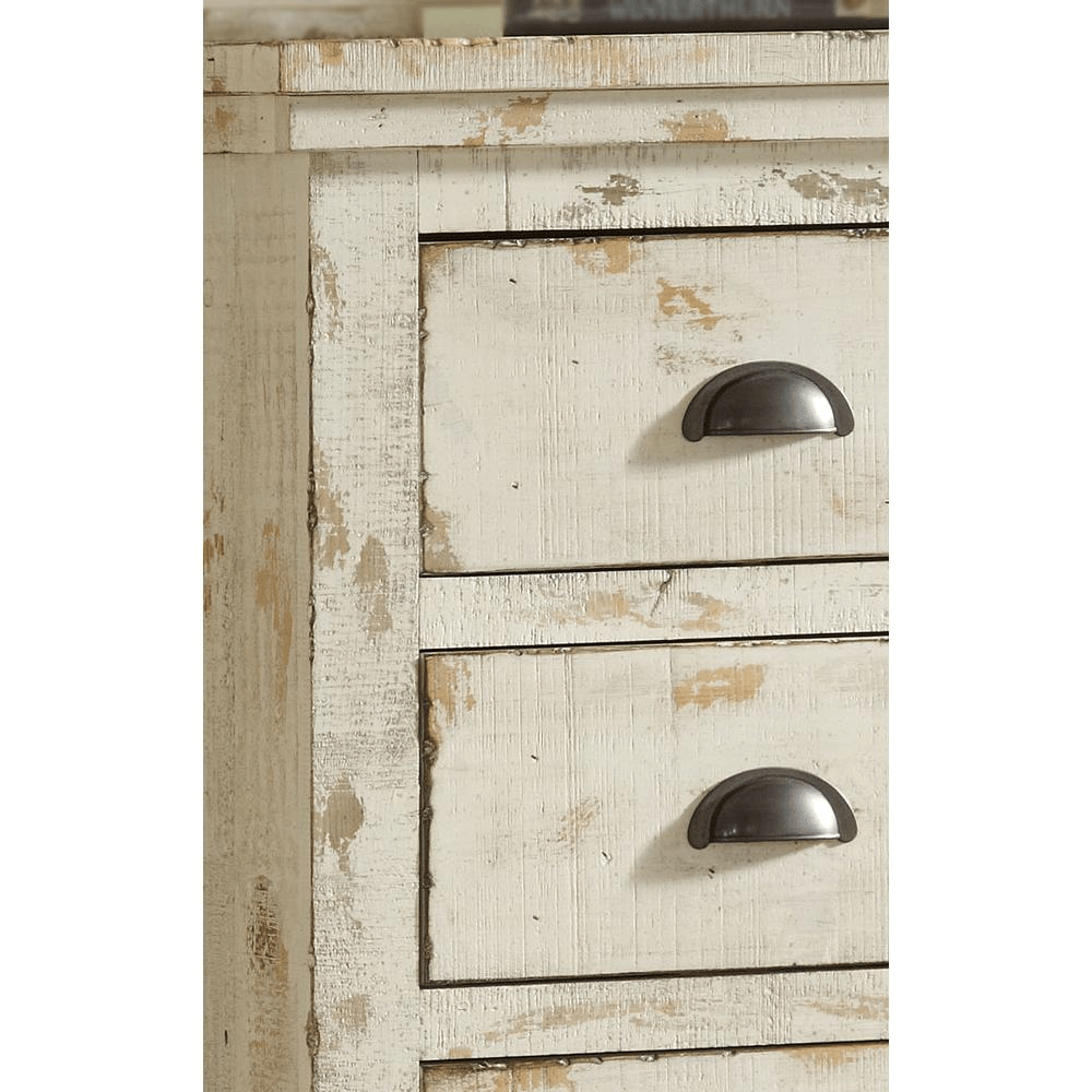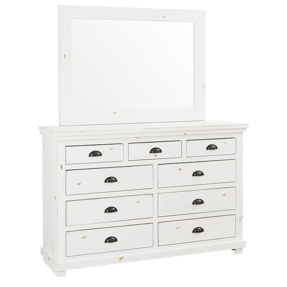 Hand applied distressing on rough hewn and planed pine solids to achieve a natural, vintage look: made to look like paint is chipped and natural pine color shows through. Tops and ends are solid planked panels, oversized thick tops and parting rails. Dresser features tongue and groove construction with pine solids produce durable cases, inset drawers constructed of solid pine drawer interiors with metal positive stop guides and gunmetal finish on nostalgic cup pulls. Mirror features an extra wide frame.
