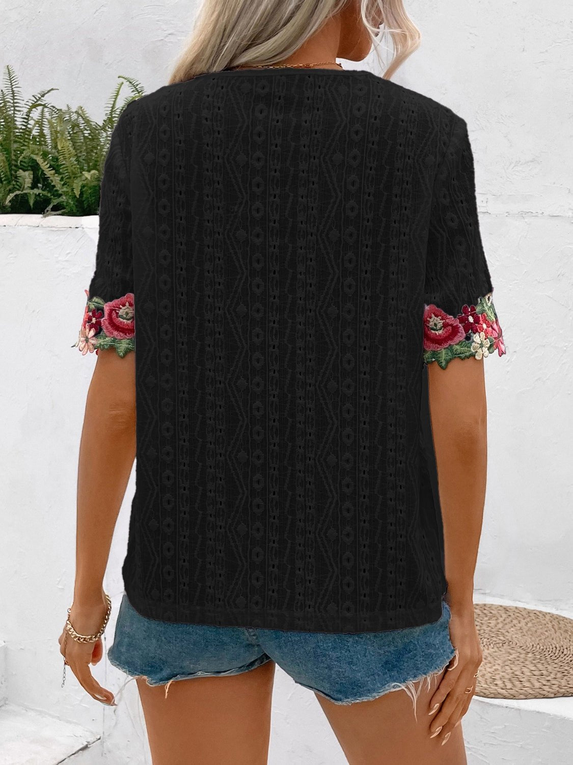 Eyelet Embroidered V-Neck Short Sleeve Blouse