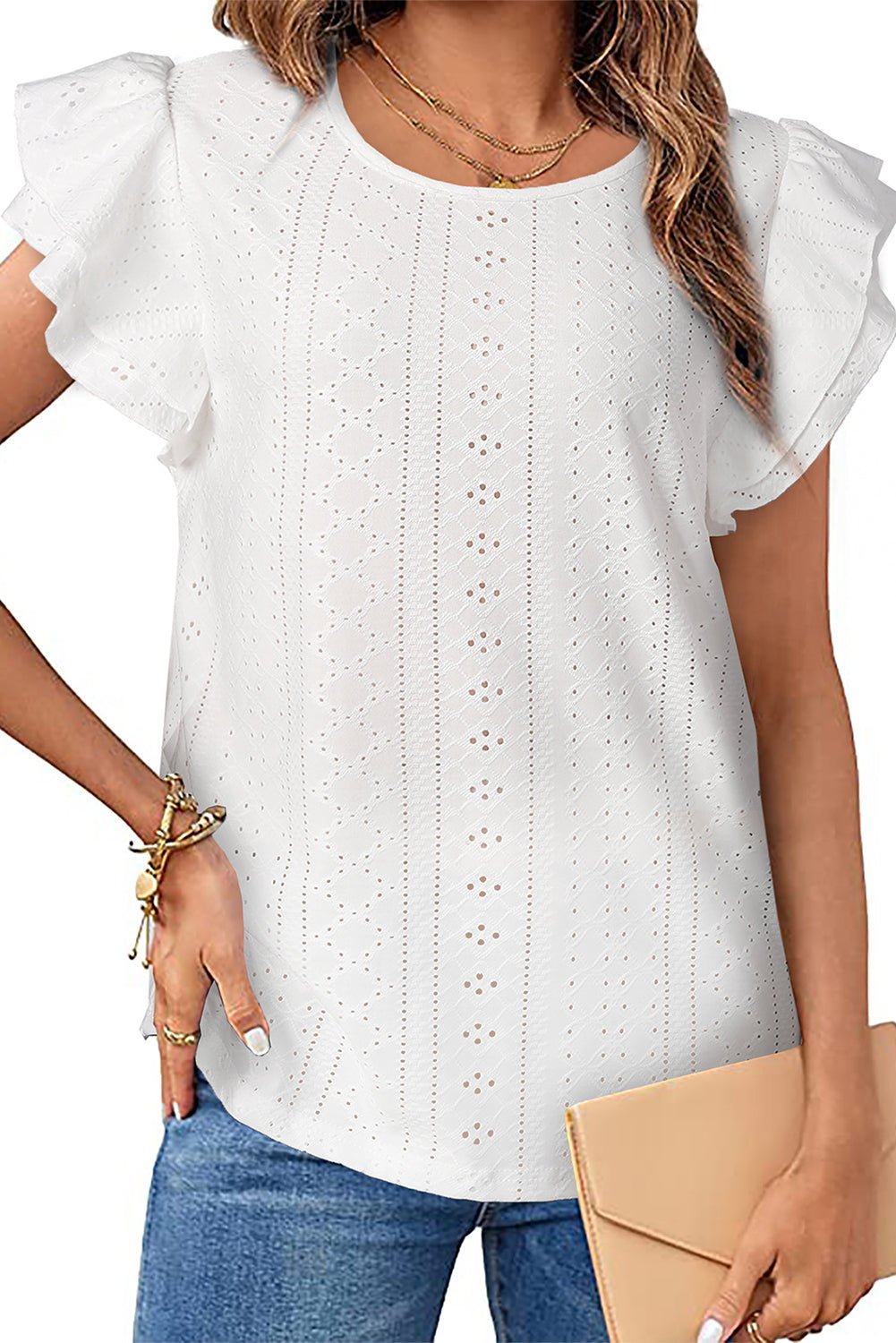 Eyelet Round Neck Flutter Sleeve Blouse