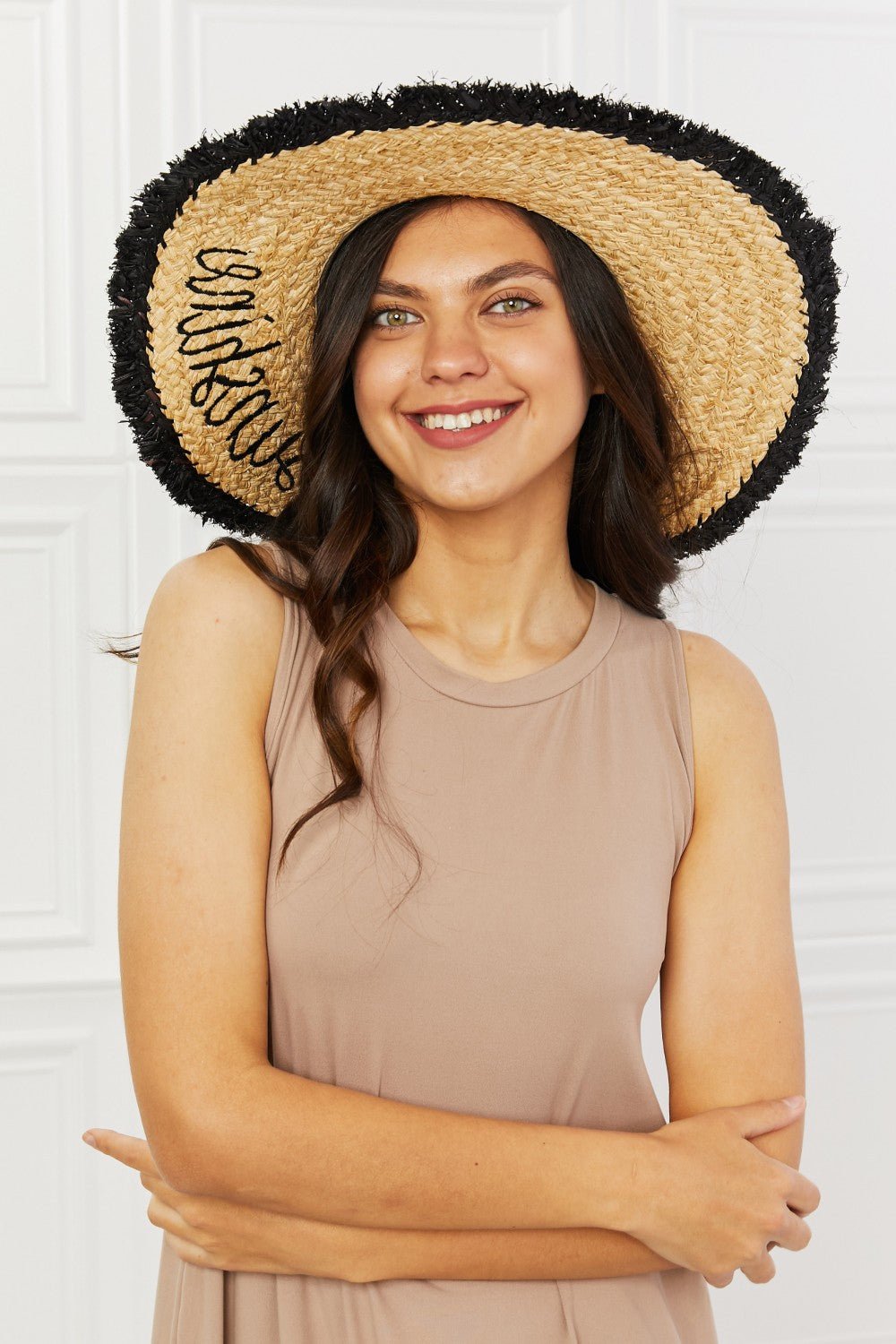 This two-tone straw hat is a summer must have! The raffia fringe rim gives the hat a boho feel, making a great beach/vacation staple. This hat featuresa fringe detail, embroidered lettering and adjustable straps.