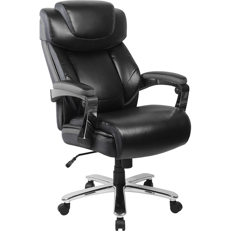 If your job or hobby requires you to sit for long stretches of time having the right chair is priceless. The thick, plush padding, black LeatherSoft upholstery and adjustable headrest featured in this Big & Tall executive swivel office chair are a must have. Big & Tall office chairs are designed to accommodate larger and taller body types. This chair has been tested to hold a capacity of up to 500 lbs., offering a broader seat and back width. High back office chairs have backs extending to the upper back for greater support. The high back design relieves tension in the lower back, preventing long term strain. The included headrest will take the pressure off of your neck while leaning back. The tilt lock mechanism offers a comfortable rocking/reclining motion. The free rein motion is great for taking a quick break from typing to answer phone calls and relax. The waterfall front seat edge removes pressure from the lower legs and improves circulation. Chair easily swivels 360 degrees to get the maximum use of your workspace without strain. The pneumatic adjustment lever will allow you to easily adjust the seat to your desired height. The chrome base adds a stylish look to complement a contemporary office space.