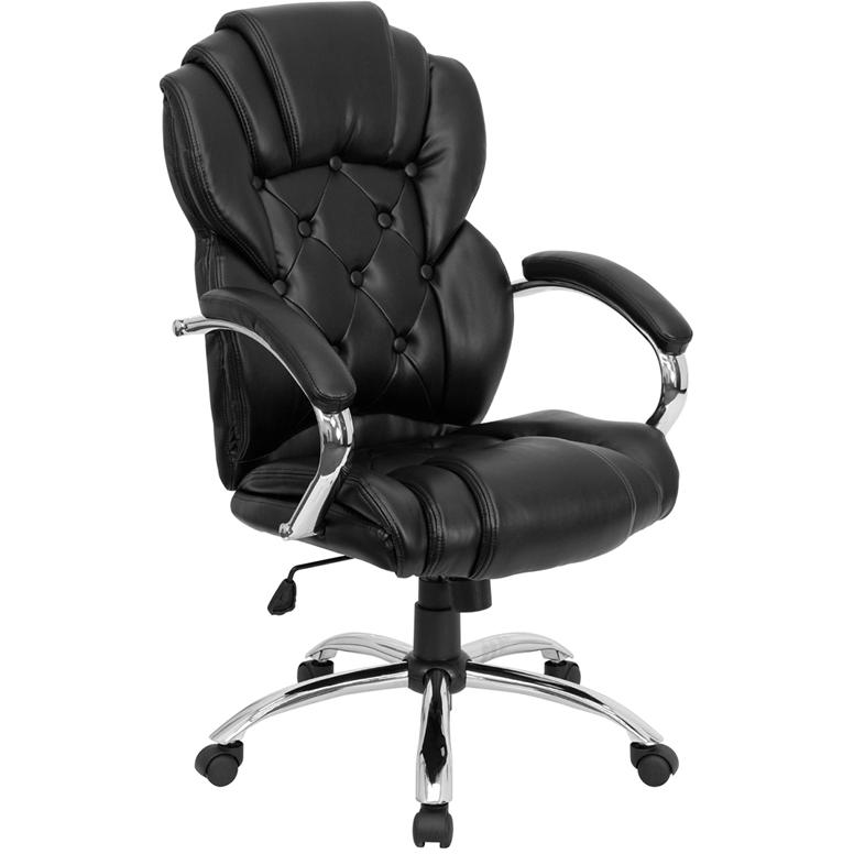 This button tufted executive office chair adds a bit of modern flair to this chair, making it a transitional style. High back office chairs have backs extending to the upper back for greater support. The high back design relieves tension in the lower back, preventing long term strain. The waterfall front seat edge removes pressure from the lower legs and improves circulation. Chair easily swivels 360 degrees to get the maximum use of your workspace without strain. The pneumatic adjustment lever will allow you to easily adjust the seat to your desired height.