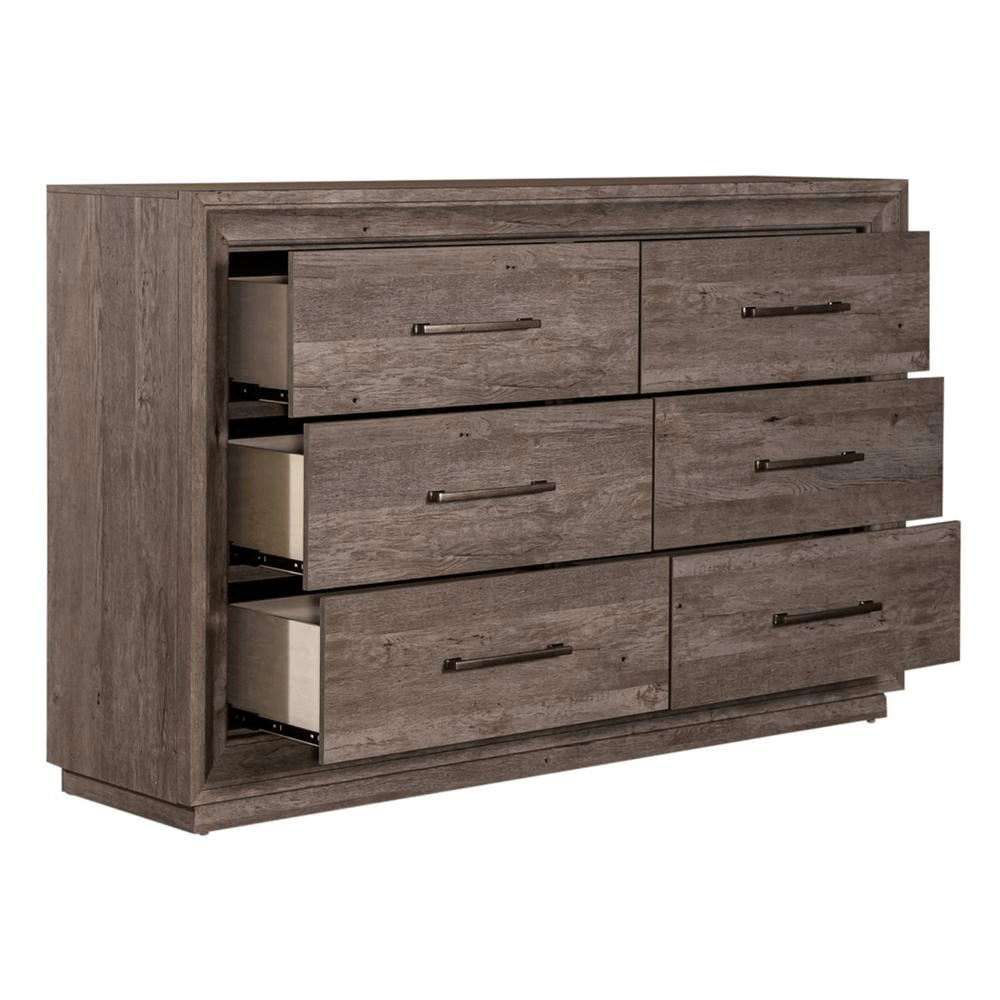 This casual Horizons dresser & mirror is the perfect addition to your room. Crafted of rubberwood solids and paper laminate, this kit features a Greystone finish. The dresser offers full extension drawer glides for easy access to storage, bottom case dust proofing to protect contents, unique picture frame moldings with an angled design, brushed nickel bar pull hardware, and is anchored by a plinth base. Effortlessly express your personality with this lighted landscape mirror with inset warm LED lights, giving you the ability to turn the lights on or off with the push of a button. Express your personality without sacrificing style with this casual contemporary collection.