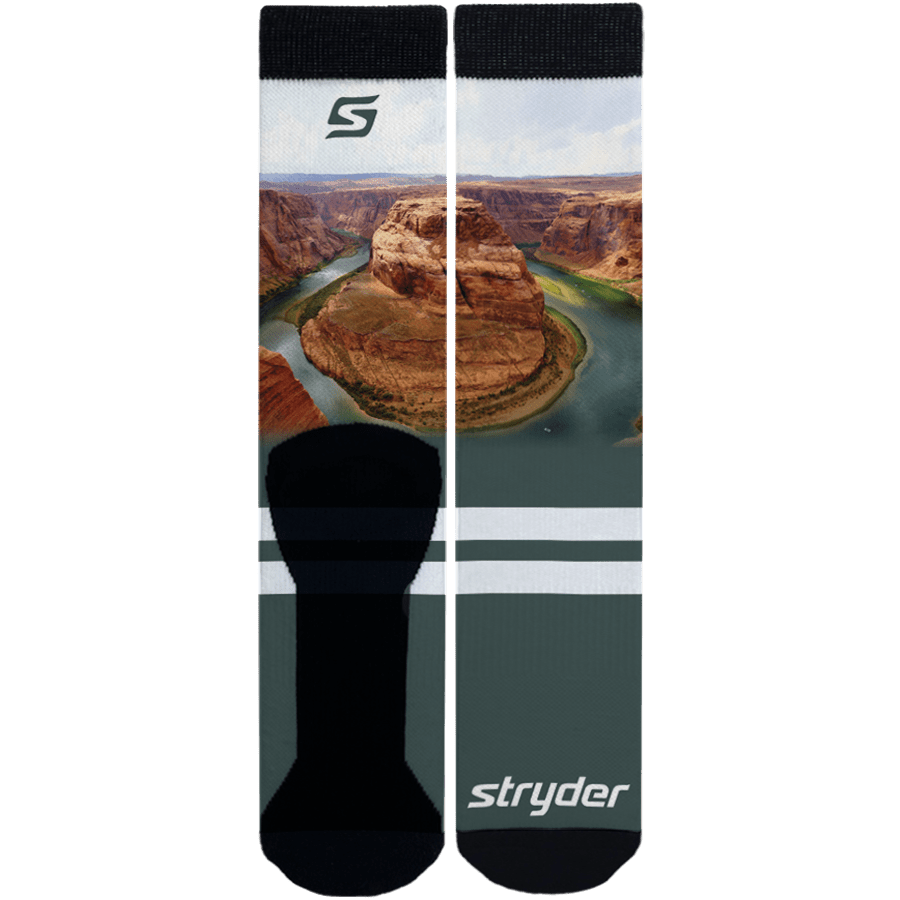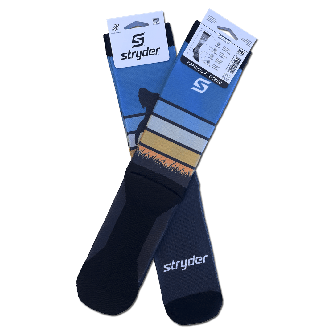 Stryder Socks are a "one size, fit most" mid calf length sock. The foot bed and cuff are made of bamboo and provides extra padding through the sole, and gives support in the arch and toe. With mesh weave on the calf and foot, you get a breathable, and moisture wicking sock.