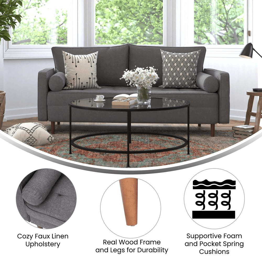 Hudson Mid-Century Modern Sofa with Tufted Faux Linen Upholstery & Solid Wood Legs in Dark Gray