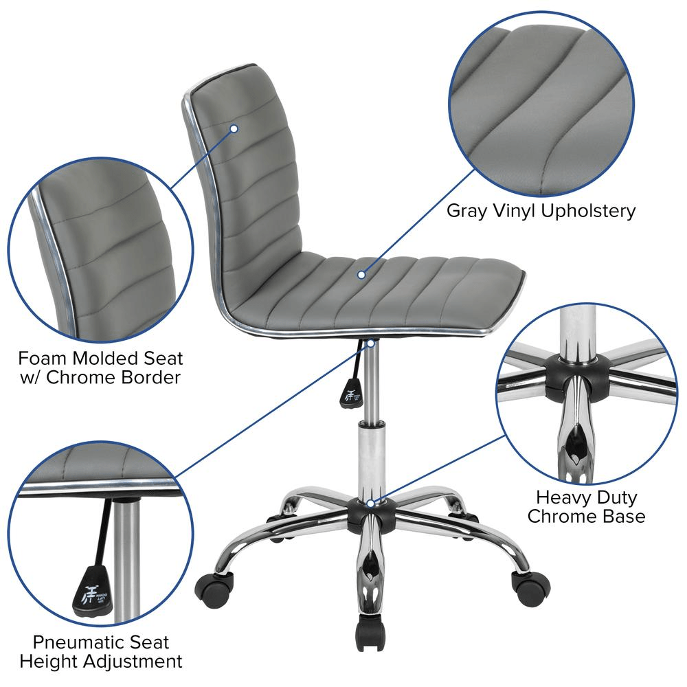 The Ribbed Task Chair will bring a trendy, modern look to your home or office. Armless chairs lend an upscale, designer feel to the conference or board room or your home office. The streamlined silhouette allows more room for members and guests while the armless design lets you roll further under your desk or table to get closer to your monitor or paperwork, without having to lean forward, preventing back strain. Upholstered in glossy vinyl with a chrome border, this chair features a low back design with a foam molded swivel seat and back. A pneumatic seat height adjustment lever lets you easily position the chair where you need it for the task at hand. This sturdy chair has a heavy duty, chrome base with dual wheel casters that make it easy to roll across the floor when you need to. This Low Back Designer Armless Light Gray Ribbed Swivel Task Chair is a great choice for your reception desk, conference room or home office.