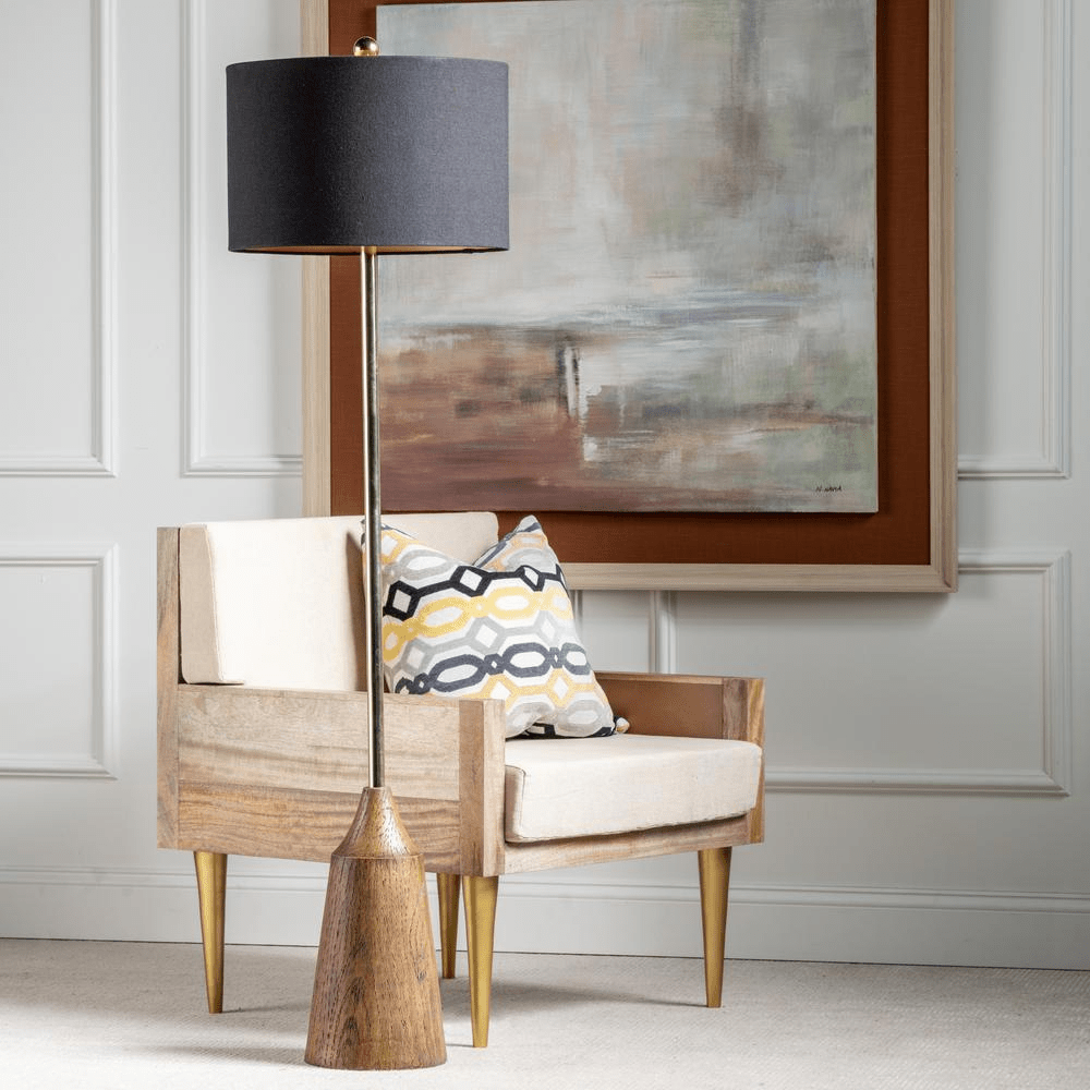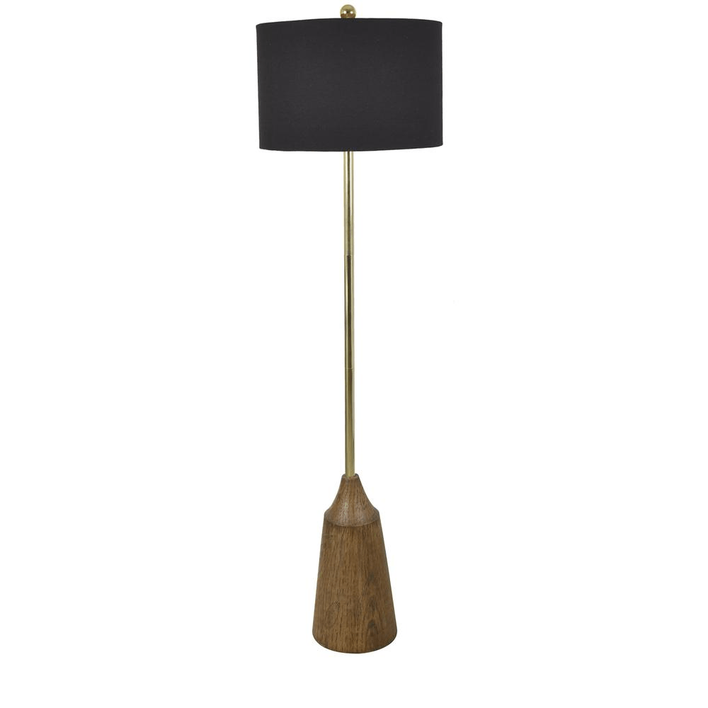 An accent that is all about refined simplicity, the floor lamp pairs sleek polished gold steel with a faux wood resin base that stands its ground. Each clean, contemporary look is topped off with a black linen shade. The perfect floor lamp to sit beside a sofa or a reading chair, will add style and function to any room.