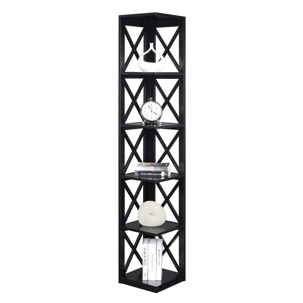 Add both function and style to an otherwise unused corner with the Oxford 5 Tier Corner Bookcase. Featuring an open space that provides 5 spacious shelves for decoration collections art and books. Available in multiple finishes, with a simply elegant crossed ""X"" design this piece can transform any space into something truly beautiful. Crafted for durability this piece will quickly become a staple in your home. Look for other items from the Oxford Collection sold separately.