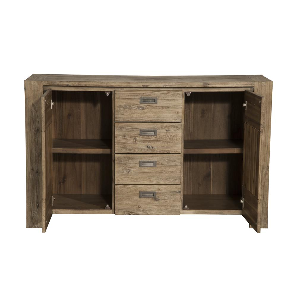 The Seashore Sideboard matches the dining group or can be used in any rustic setting. Brass hardware compliments the Sandblasted Antique Natural finish on solid Acacia wood. Handcrafted in Indonesia, this fully assembled piece provides ample storage with four drawers and cabinets with adjustable shelves.