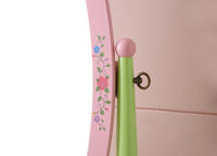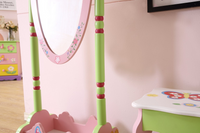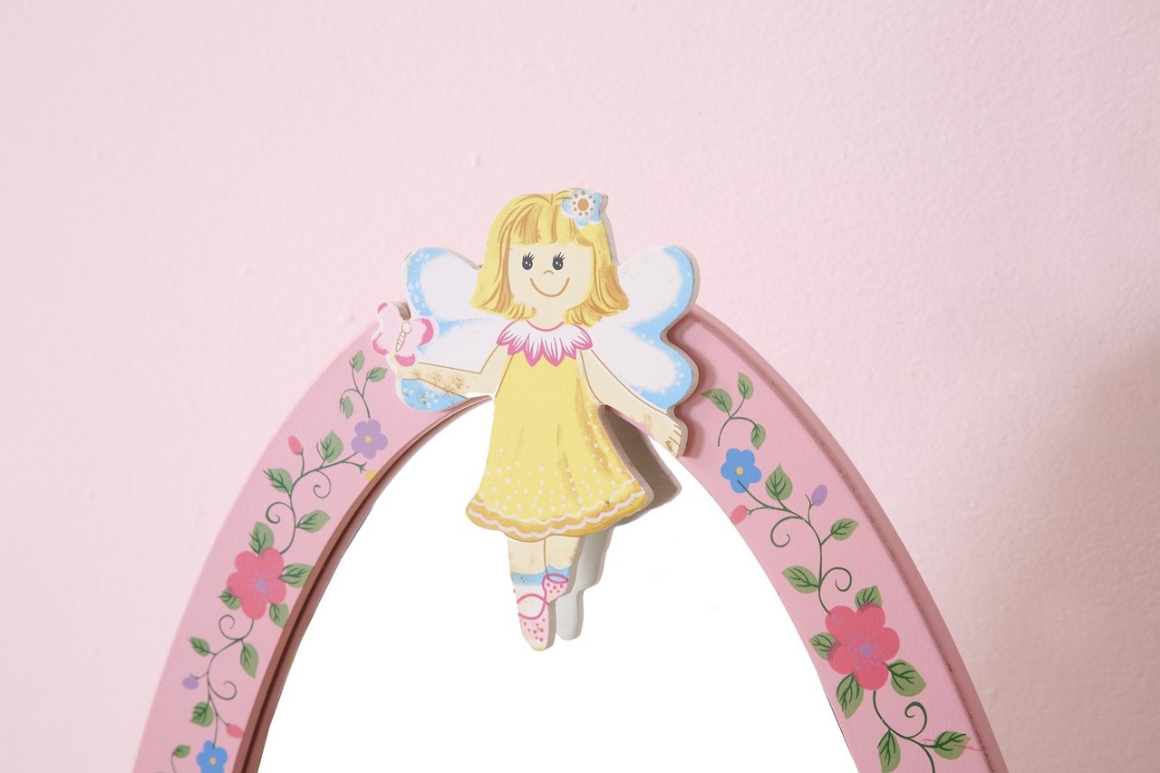 Our Wooden standing mirror is an essential addition to any little girl’s bedroom or playroom. This classically styled mirror is designed with quirky fairy, butterfly, and flower motifs to add a dash of cheer to any space. It is large and oval-shaped, and a sturdy wooden frame supports the shatterproof glass. Underneath the mirror, you’ll find a compact storage space for stuffed toys, books, or other knick-knacks.